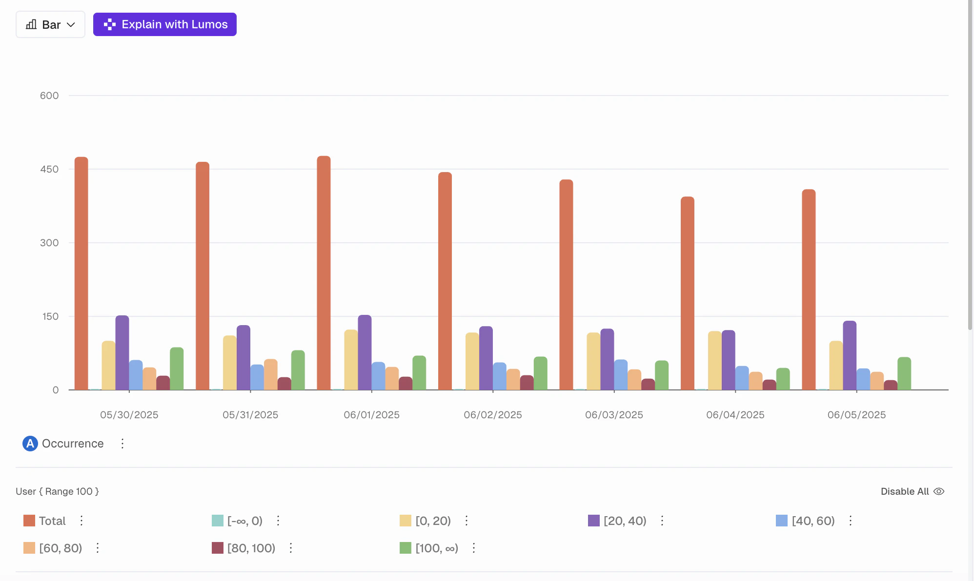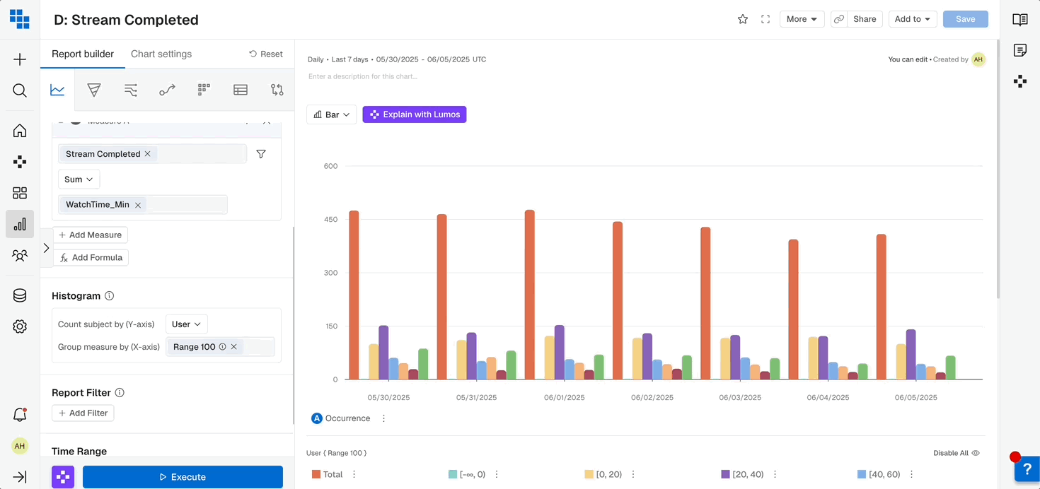 This example shows a histogram of Users based on the SUM of Minutes Watched on a Streaming Application. The Range of 100 means each Bin size is equally distributed up to 100 minutes.