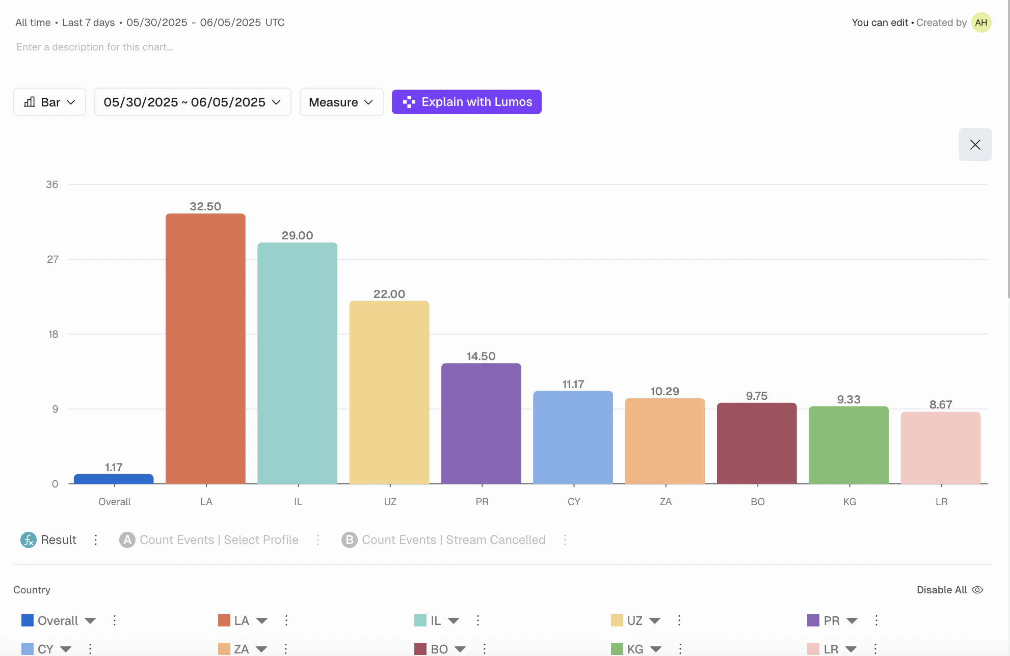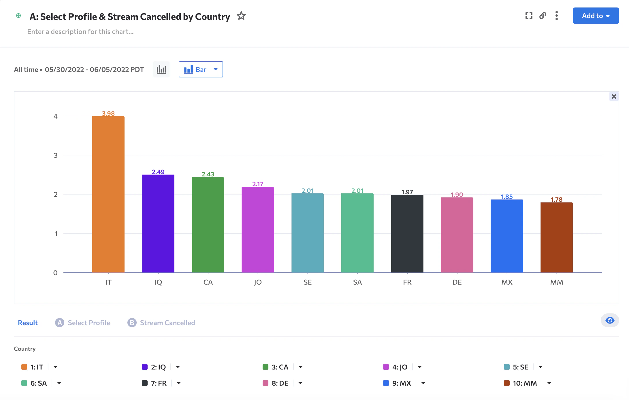 Measure Filters allow you to easily exclude outliers, especially when breaking down ratios. Let’s consider the following example: It’s a simple ratio broken down by Country and interestingly there are some very high ratios: Taking a closer look we can see the reason for the high ratios are the very low denominators. And this is the whole problem we are trying to solve here, very often when analyzing huge volumes of data there will be these outliers which creep up the order and prevent us from seeing the actual patterns clearly. Let’s apply a Measure Filter to find all ratios where B > 100, so we can get a more representative order. And sure enough, we get a very different top ratios from a different set of countries. Note how all the B measure values are > 100: