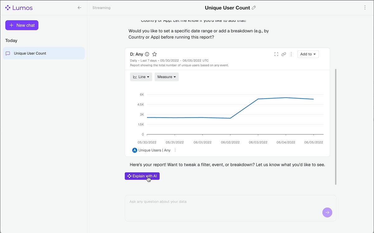 Once you’ve landed you can type in your question, use case, or report definition in the “Ask anything” box at the bottom. You can also start your chat with one of the 3 pre-built prompts by simply clicking on them.