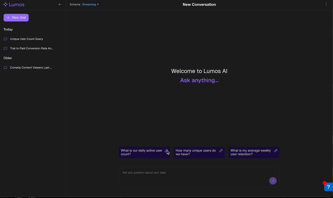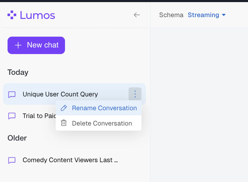 Each chat you generate in Ask Lumos will be saved along the left hand window. You can access these chats again, pick up where you left off, or delete them to clean things up. You’re also able to rename them to make sure you remember what you discovered.- Hover over your Chat in the left hand panel and click into the vertical 3 dot menu to access these options.