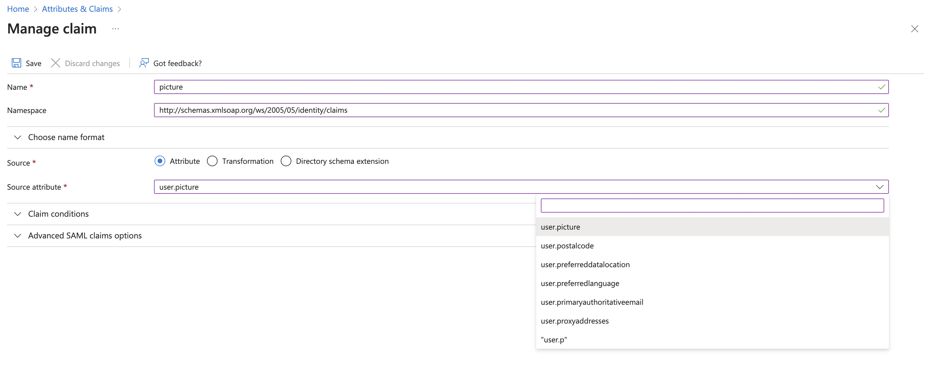 pictureas Name and the valuehttp://schemas.xmlsoap.org/ws/2005/05/identity/claimsas Namespace. Search for a picture or photo attribute under the Source attribute field. Click on the attribute to select it and click the Save button.