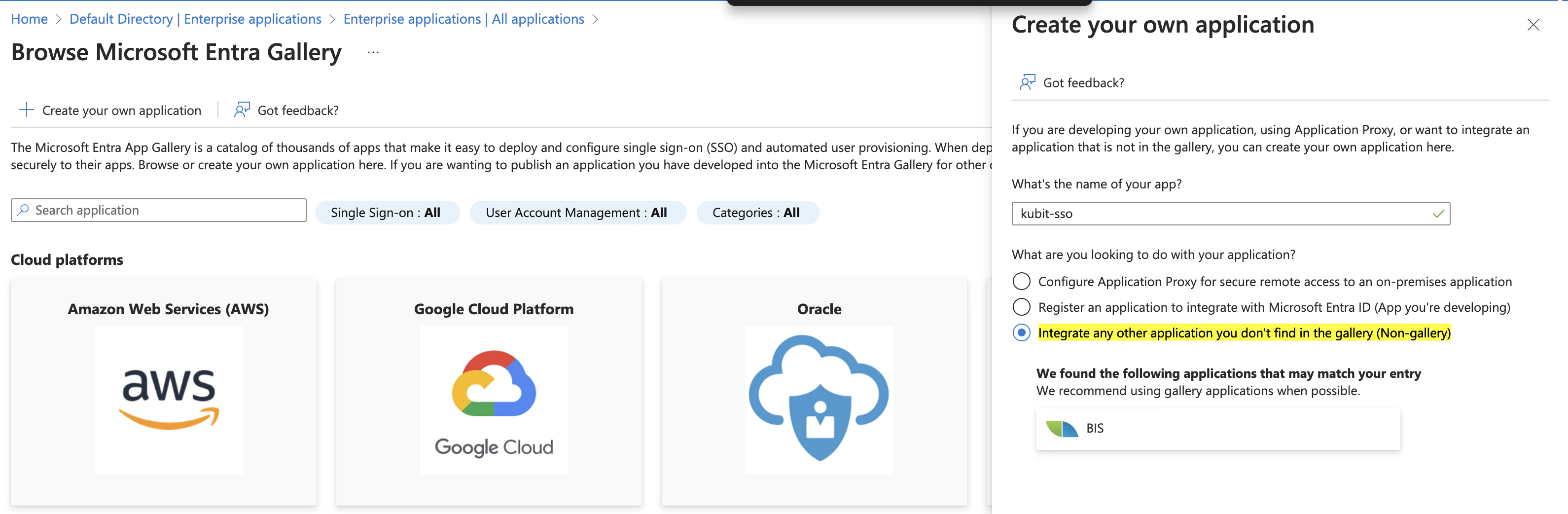 kubit-ssoand select Integrate any other application you don’t find in the gallery (Non-gallery). Then choose Create.