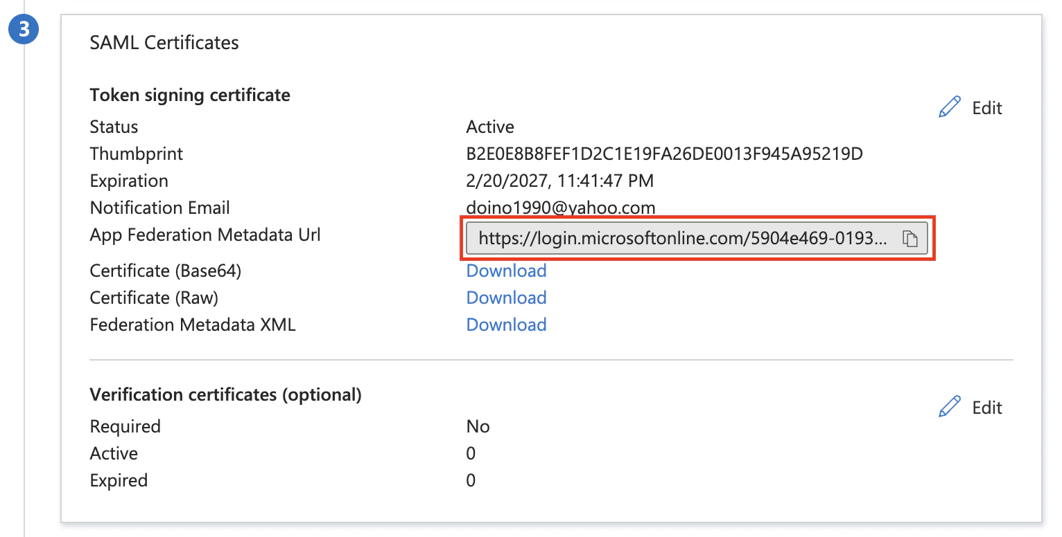 Scroll down to the SAML Signing Certificate section, and copy the App Federation Metadata Url by choosing the copy into clipboard icon. Please provide that URL to the Kubit Team.