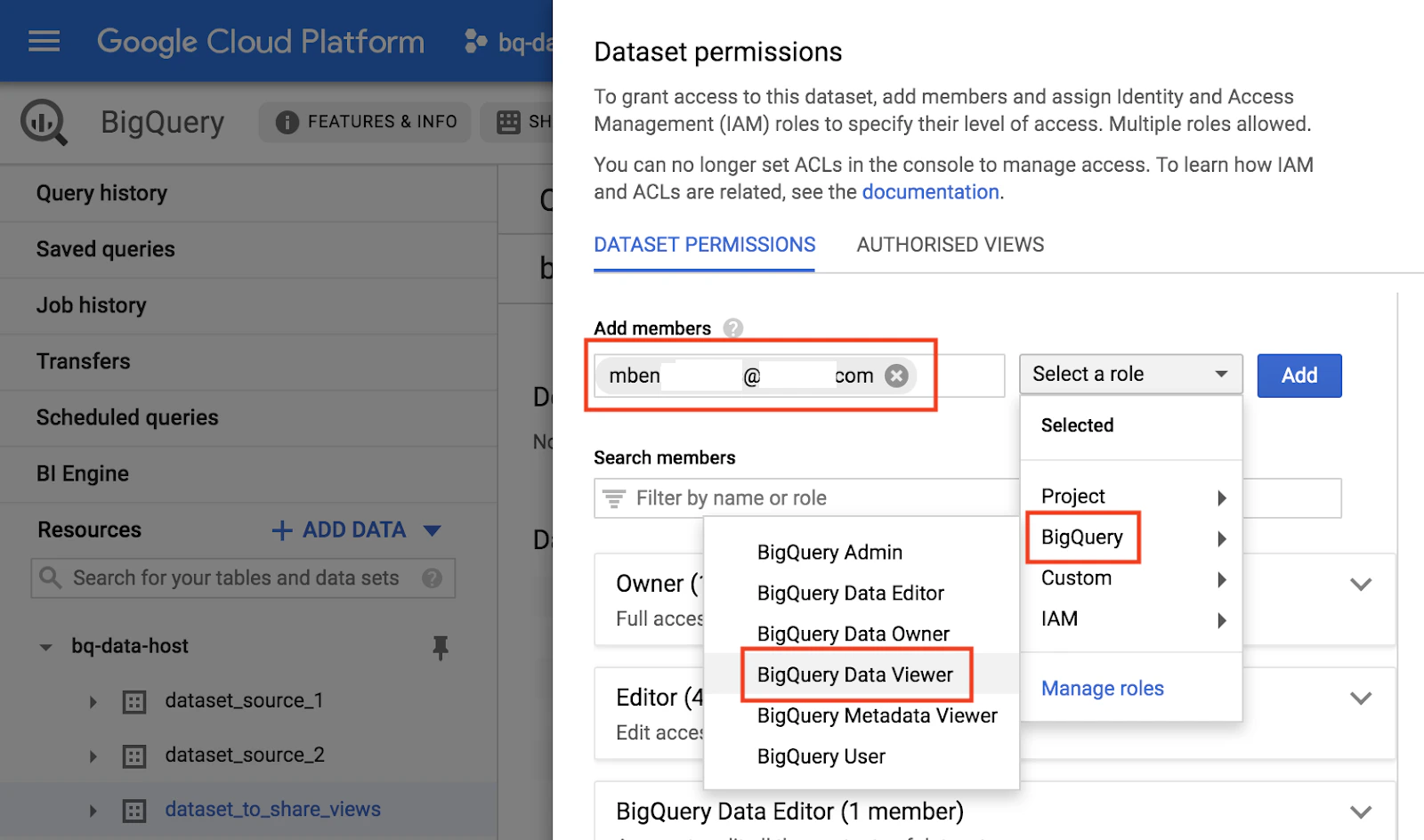 Share datasetpanel, in theDataset permissionstab, enter the previously created Kubit Service Account Email to theAdd membersfield. Then select the role BigQuery Data Viewer, clickAdd, then clickDONE.