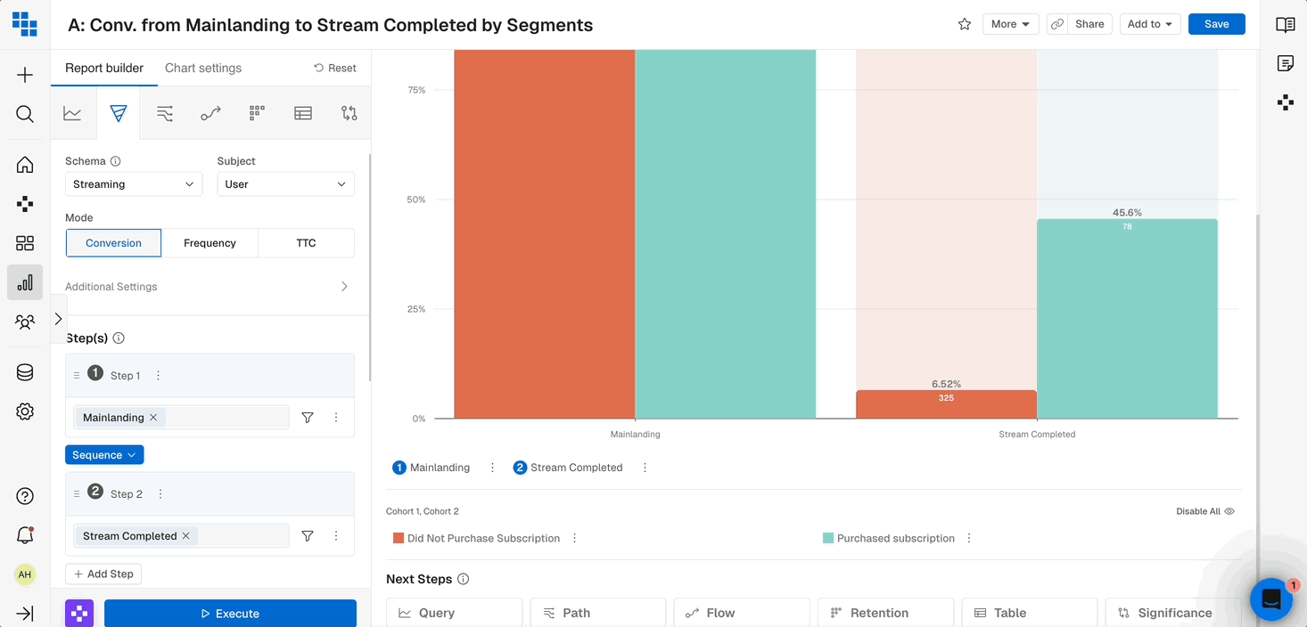 Within each report type, you’re able to add Cohorts of Subjects to breakout the results by if a Subject is a member of a Cohort. The best way to think of this is rather than breaking down by a value within a Field, you’re breaking down by the behavior of a group of Subjects. Here is a quick example: You want to see the conversion rate of a checkout funnel but you need to see if the conversion rate is different for Users who have Enabled Notifications. Enable Notification is an Event and not part of the checkout funnel…so how do you add this logic to your Funnel Report? The answer: Cohorts