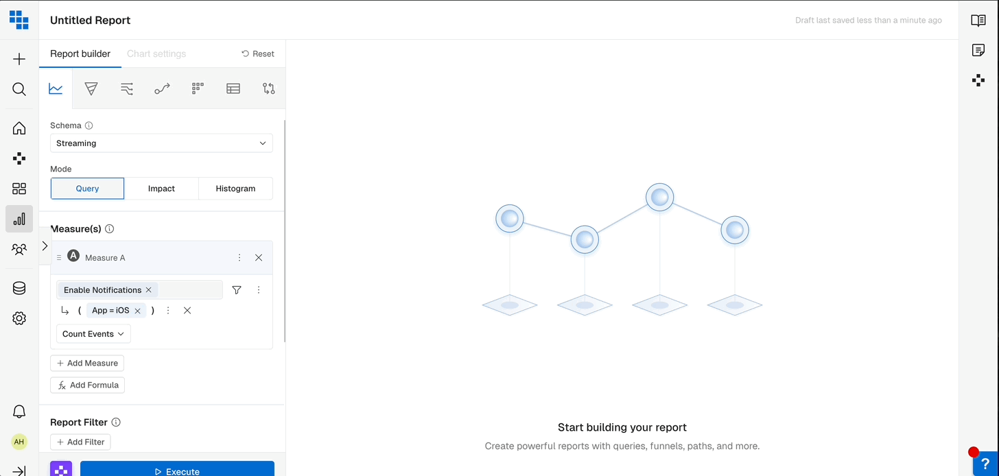 Measures are only available in Query and Data Tables. They include one Function (e.g. “Count Events” or “Unique Users”) applied to at least one set of Events each can have its own Event Filters.Create a Measure