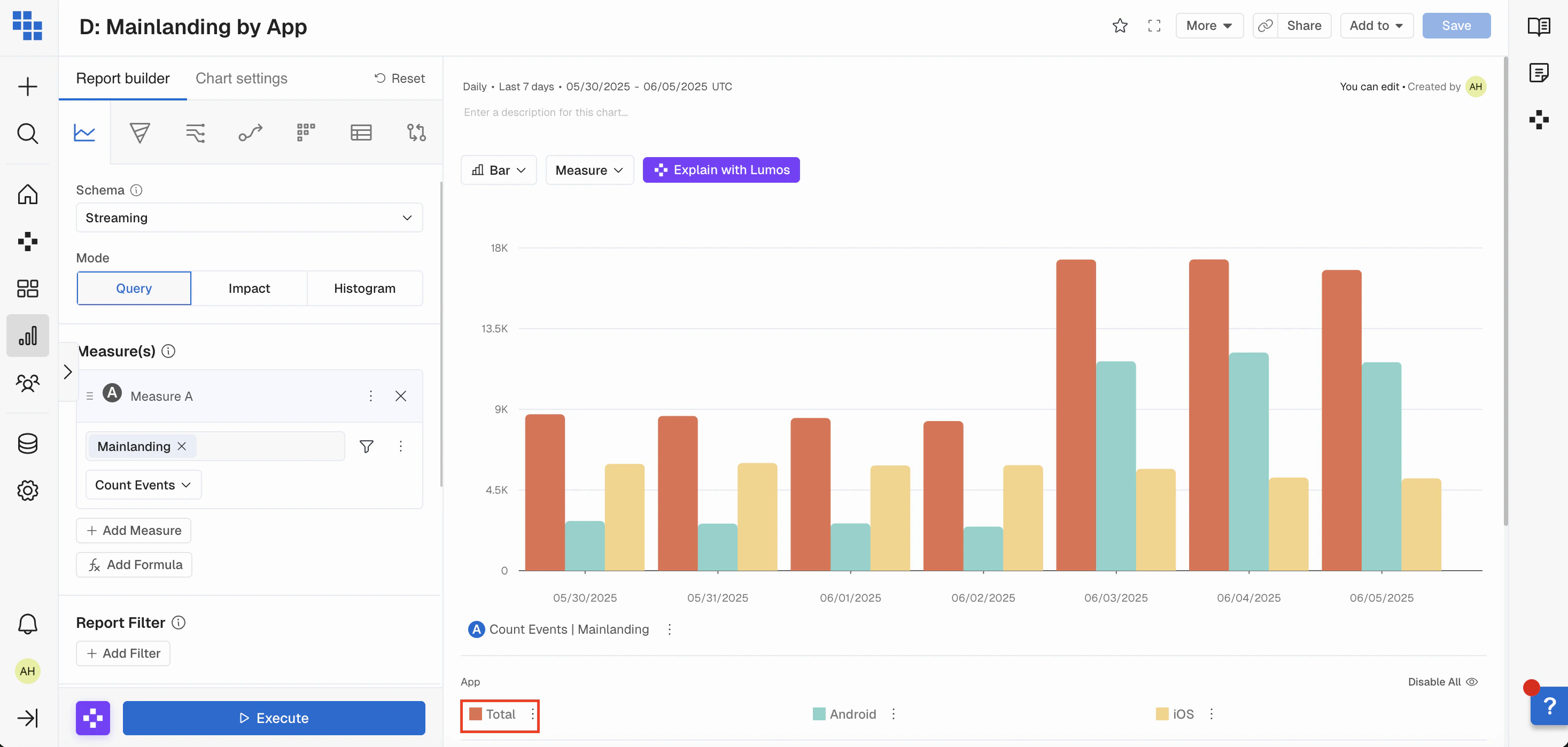 When you execute the report with Overall turned Off the “Total” result will be a simple cumulative sum of all the values within your results based on the time frame you’re using.- Example: If you’re looking at a breakdown by App with Overall turned off by Day, the Total bar will be a sum of each App group for each day.