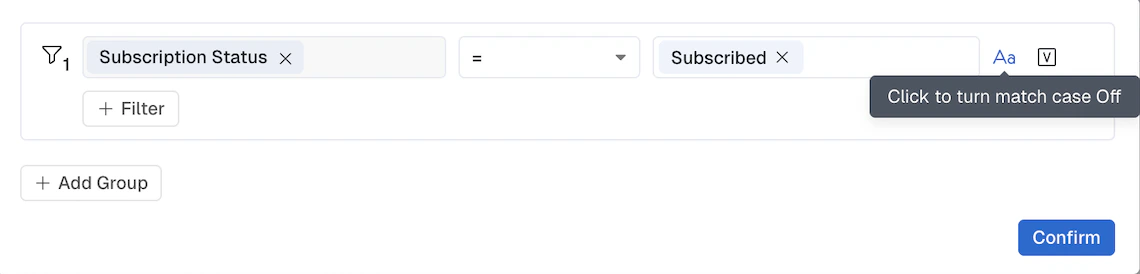 In Kubit we default to text filters being Case Sensitive, meaning if you filter to subscription_type = ‘Premium’ then the underlying data must have the capital ‘P’. If you have instances where the cases are mixed within a column you can disable case sensitivity by clicking the “Aa” button. If it’s blue then it’s enabled and grey is disabled.
