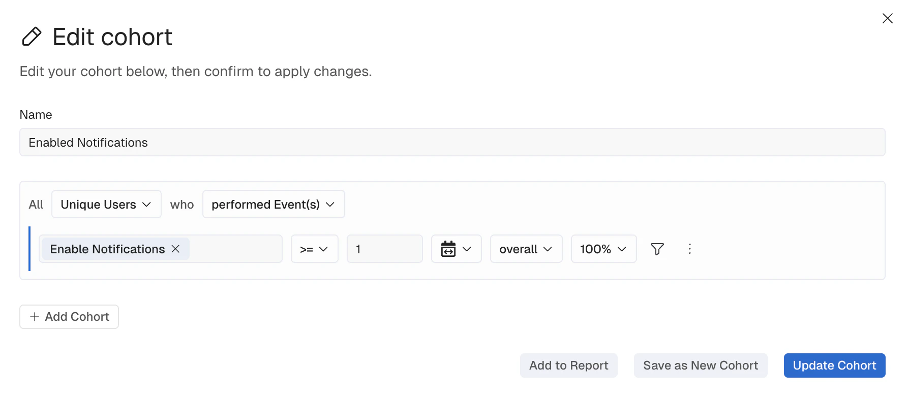 Enable Notifications event and then compare it to the Overall group. You’re also able to create another Cohort of Users who did NOT perform the Enable Notifications event and to ensure the groups are mutually exclusive.