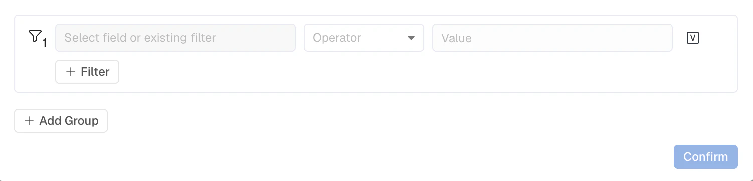 Creating or modifying a filter works the same way in all areas of the Report Builder. You click to create a filer, then choose the properties mentioned below. Once you click on Confirm, you’ll see it in the Report Builder. To make changes, simply click anywhere in the defined filter. You can toggle AND/OR right on Report Builder. No need to enter an edit screen.