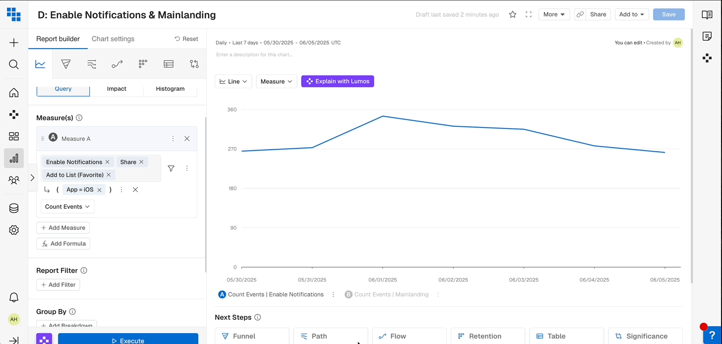 Left click on all supported charts except Flow opensCreate Cohort and Inspect User actions. You’re also able to create an Incident directly from the Report. This helps other users see major disruptions or launches to explain shifts in the results.