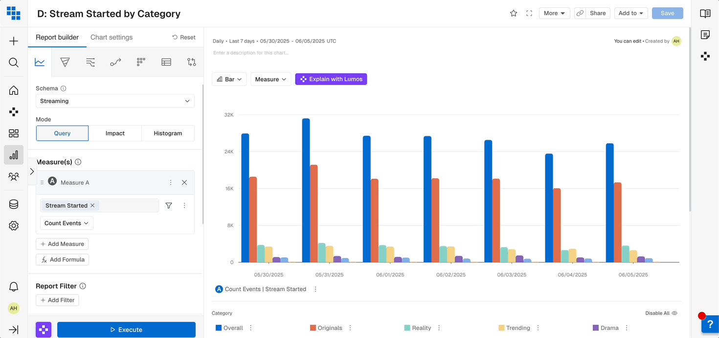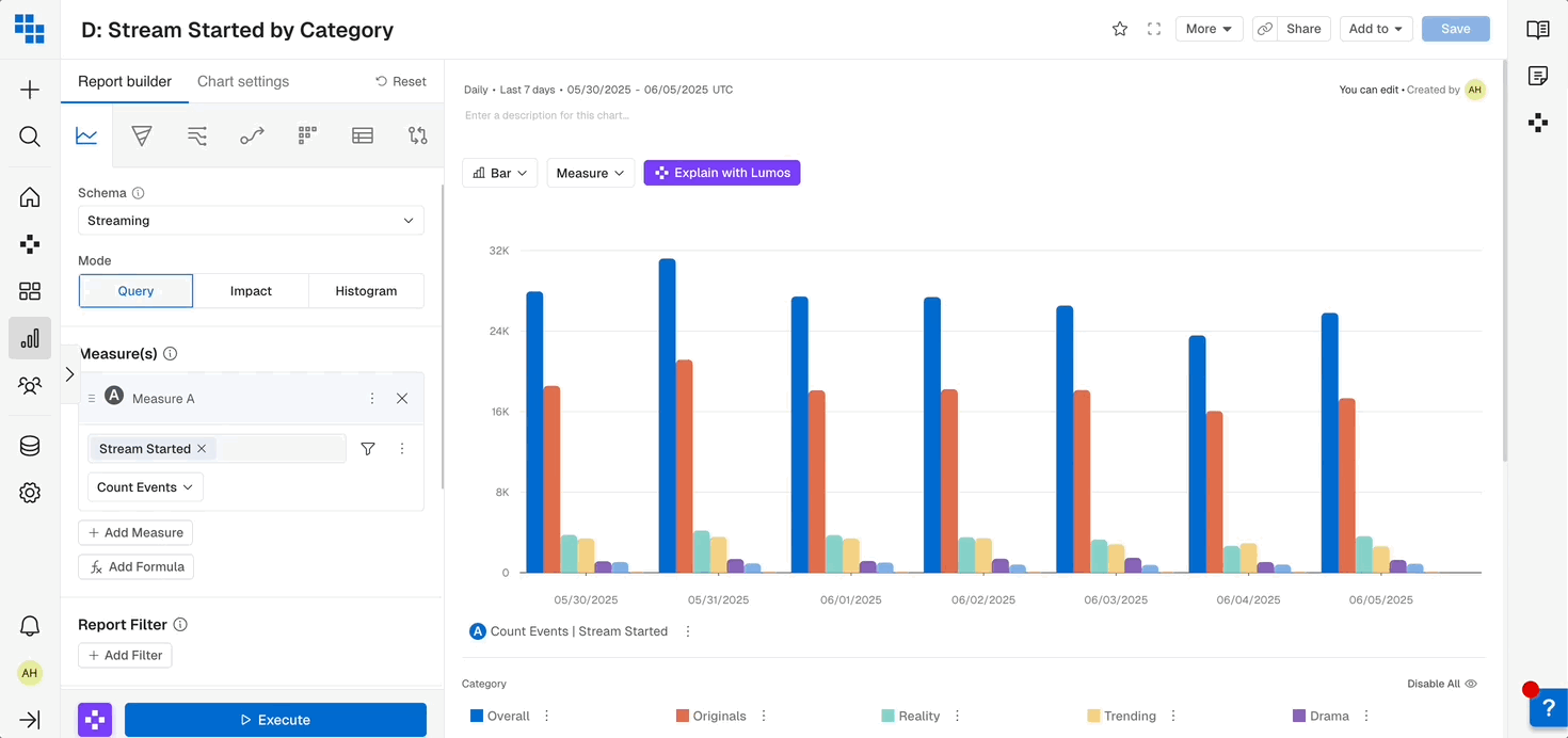 Within the Breakdown, you can toggle between having all of the groups Enabled or Disabled. The best way to think of this is if you want to remove a Group from the view OR if you want to focus in on a specific group or groups for deeper analysis. Here is a quick example: You want to see how many Stream were started by the Category of the content. You then want to disable certain Categories for a deeper look at certain categories. You can click to disable the Categories to remove. THEN you can reenable the view of all by clicking Enable vs each individual button.