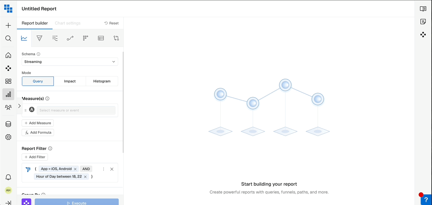 When you’re analyzing data it’s important to be able to slice it by various attributes of the User or Event. Breakdowns allow you to group the results by these fields and even Bin them into more meaningful groups in Query . Breakdown by a Field: Select the field you want to break down by to see results grouped based on the values of that field. These can be things like “User Type” or “Subscription Mode”. 🎥 Watch our Breakdown Training VideoCustom Binning