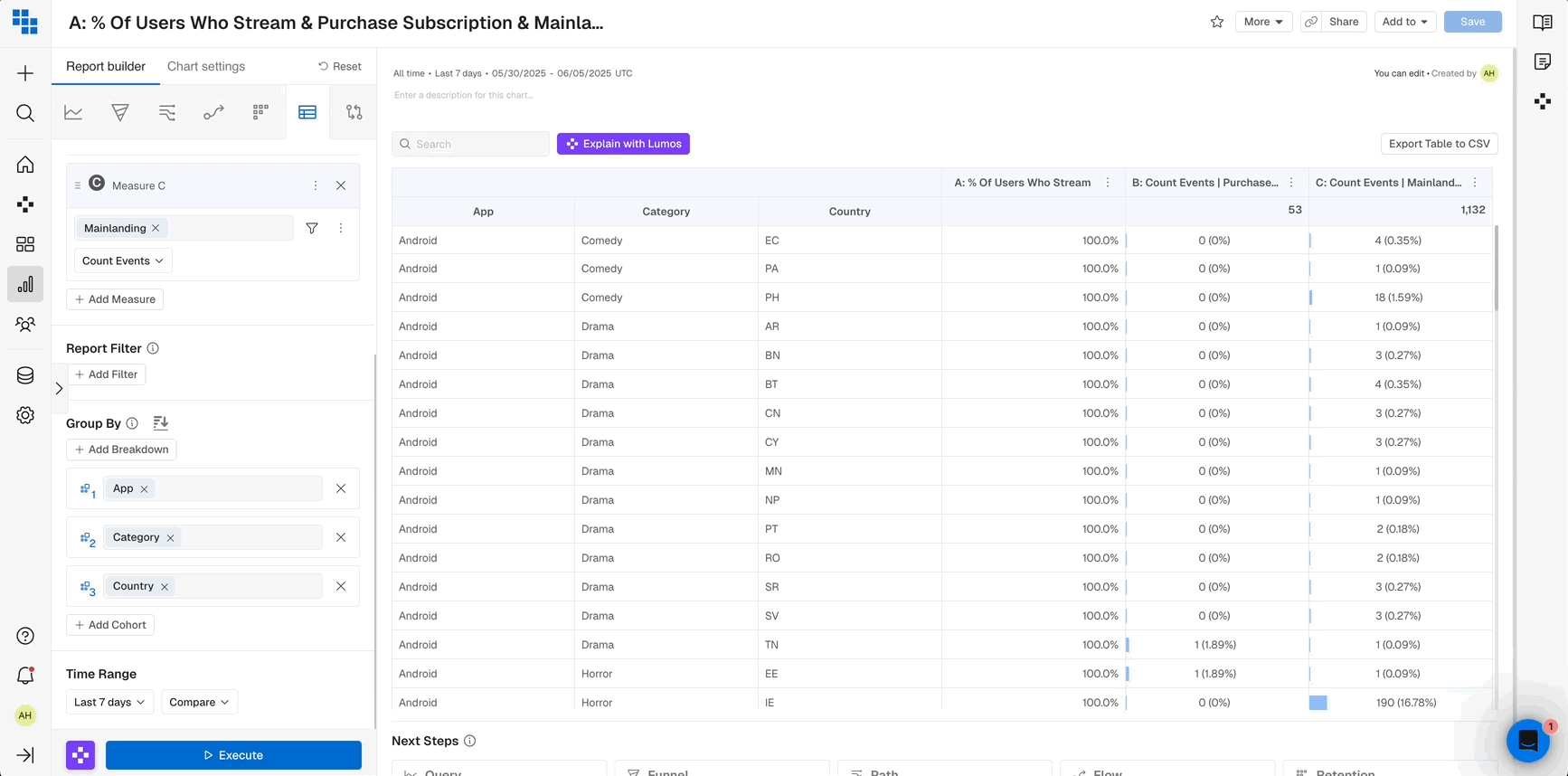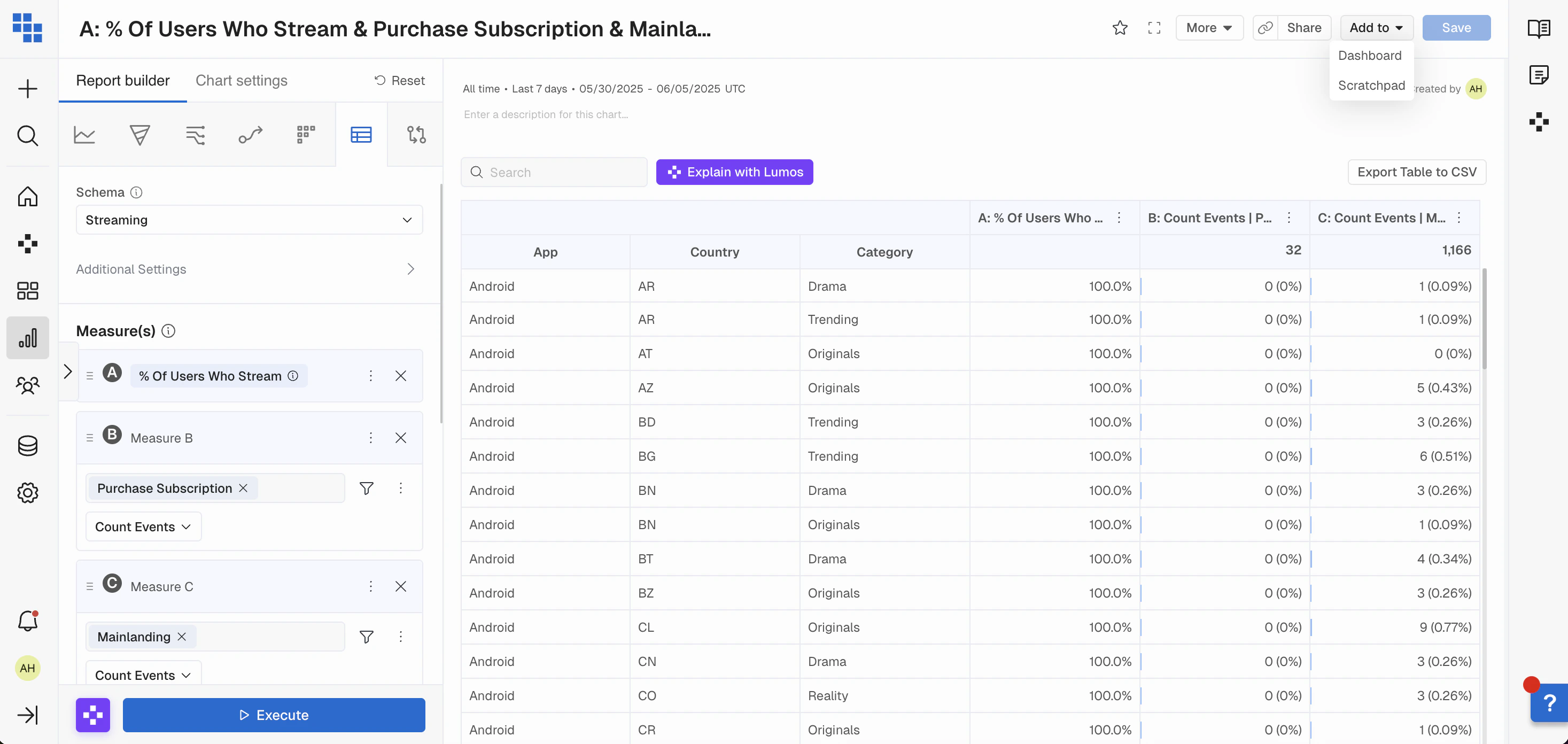 Once executed the result will be a pivoted view of:- Rows for each breakdown group you’ve applied.