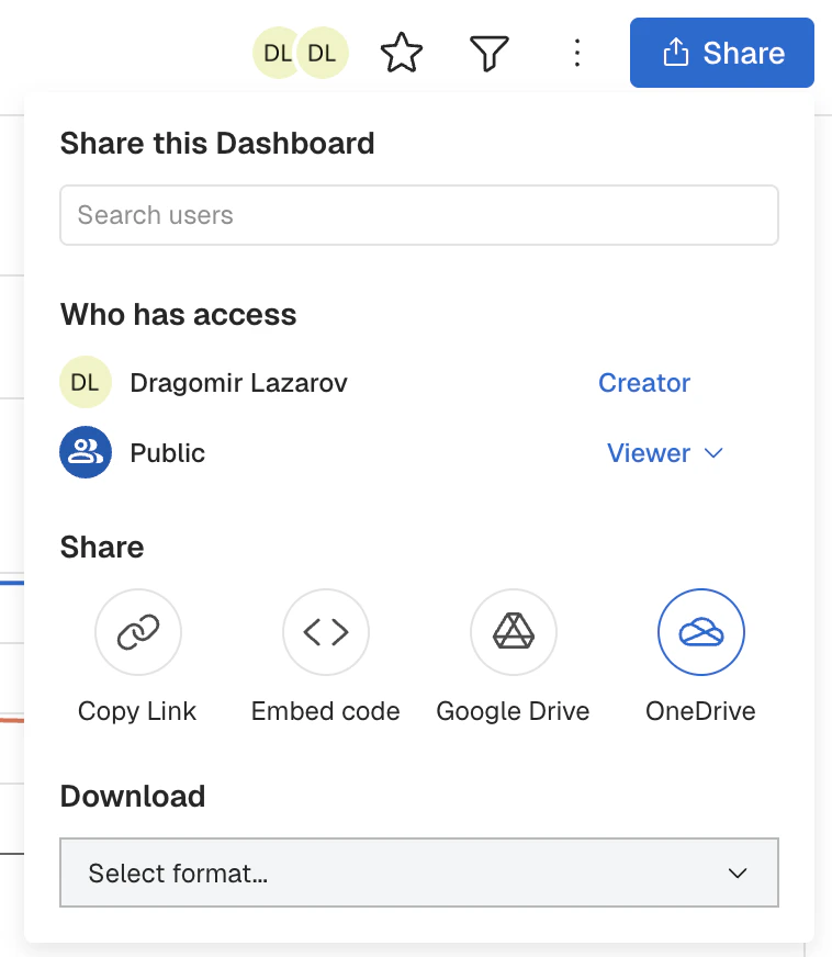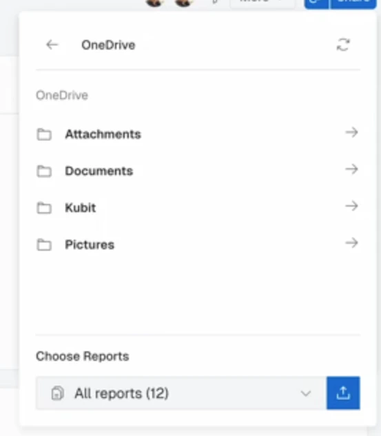 Before you can begin leveraging the ability to download directly into OneDrive, you will need to connect Kubit. Connection can be done two ways:- Via the ‘Share’ button on a Dashboard: