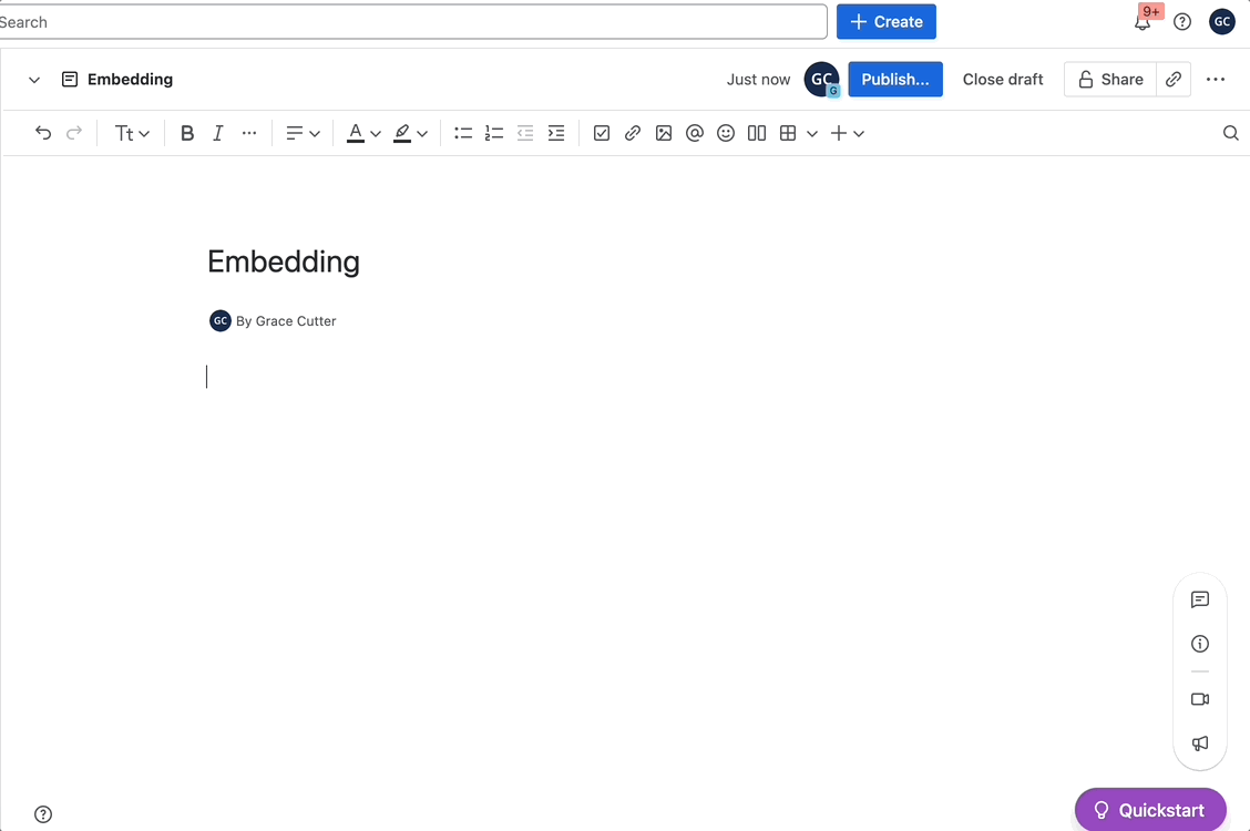 Content is embedded by pasting the URL into Confluence. Then use the options button on the URL to select Embed and wait for the widget to load.