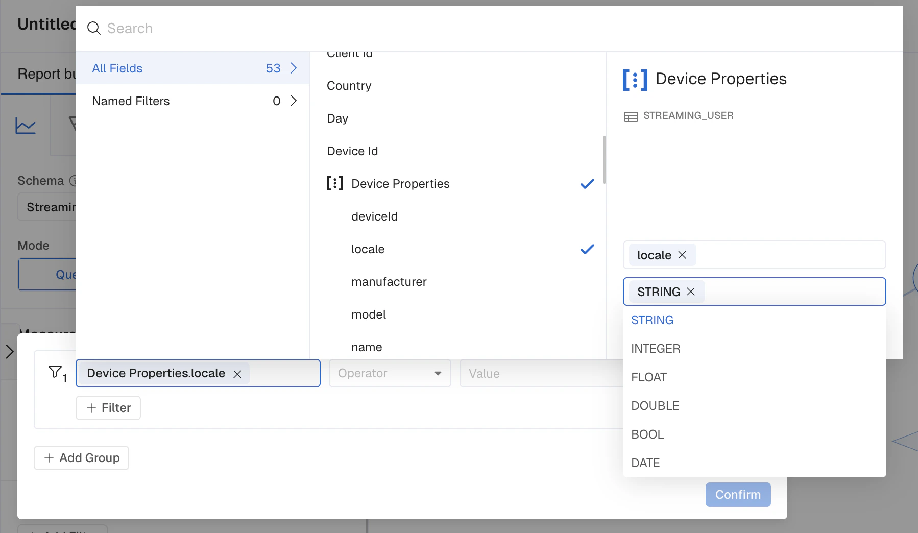 - After selecting the JSON Key, choose your operator (if using as a filter) or continue building and execute your report.