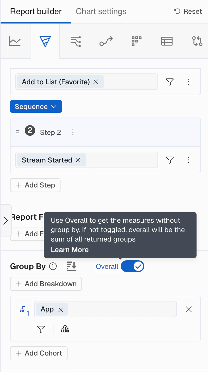 - Compare each group and Overall, providing total conversion rates for all users. This is useful for establishing a baseline. Enable this by turning the Overall switch to “on” (it will show blue), revealing an Overall group alongside the Breakdown groups.