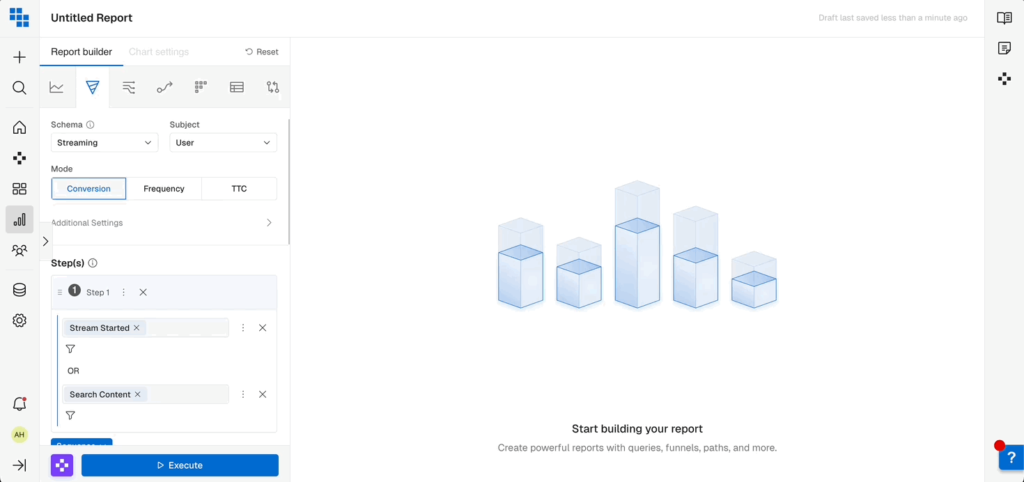At the bottom of Funnel chart controls, you’ll find a dropdown button with “Event” and a ”+” option for day(s). Use this to extend the time range of your funnel, allowing for longer conversion windows. For example, to understand “Trial” to “Renewal,” extend the time from the “Trial” event by a specified number of days.