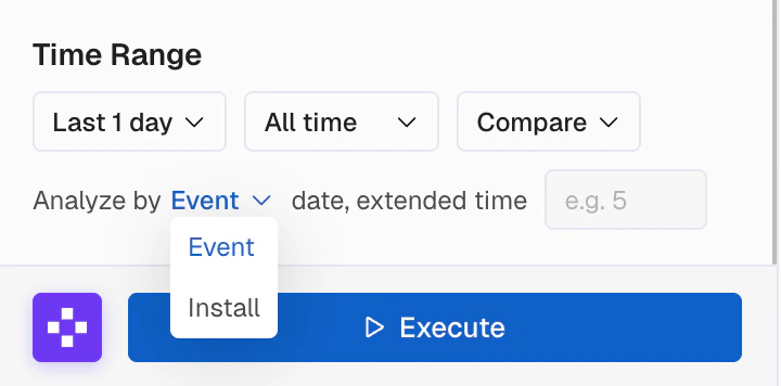 - Install: Shows users who installed your product during the selected time range.