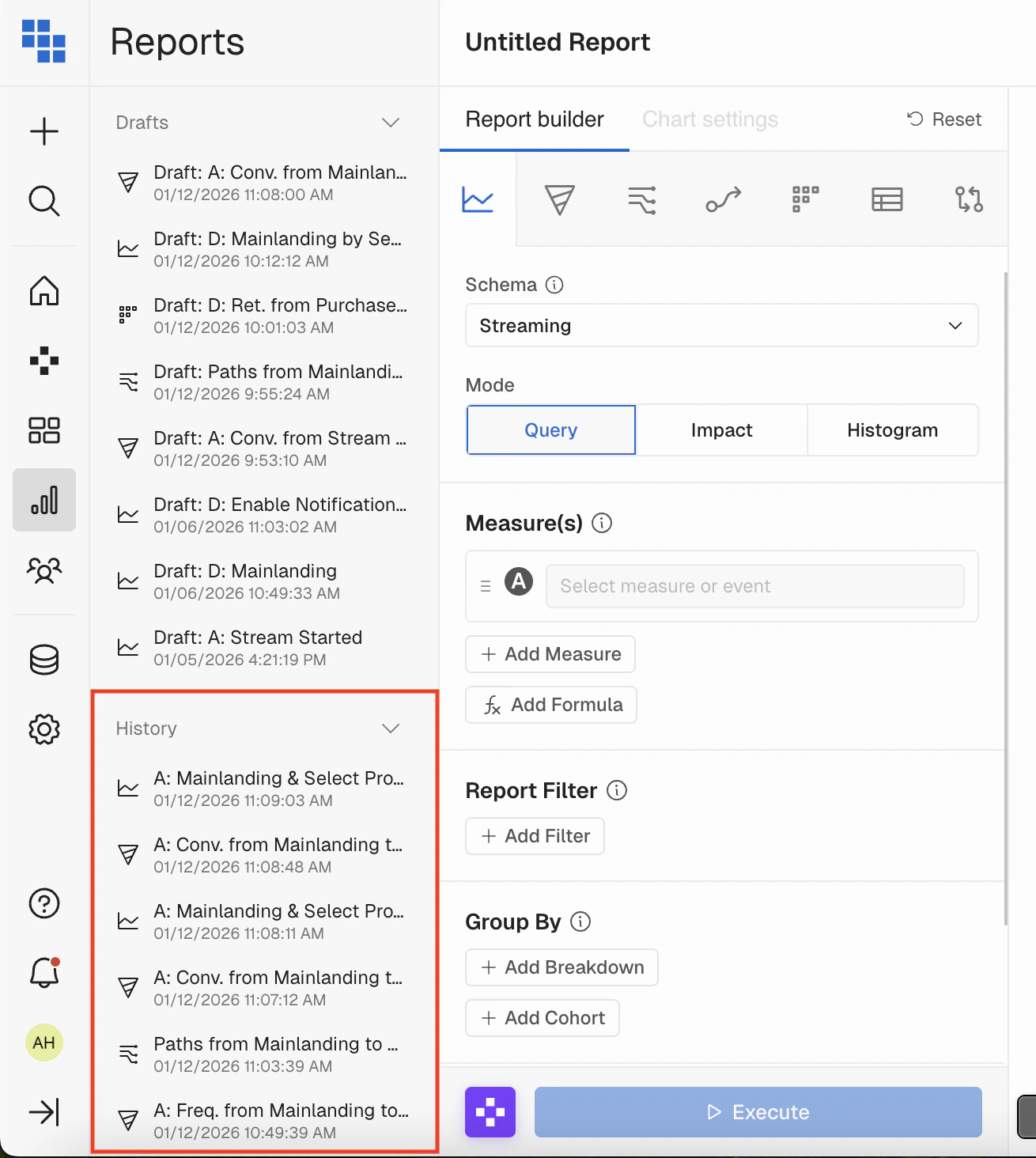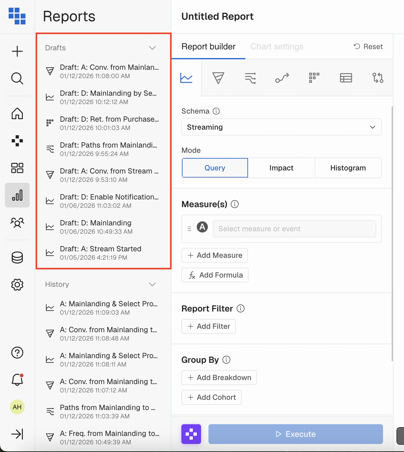 TheDrafts feature provides users with a persistent, session-independent way to retain unfinished report work. Drafts are automatically saved when you begin creating or editing a Report without executing it. Your Drafts appear right on top of your History, are capped at the 10 most recent, and persist across sessions. Drafts help you maintain workflow continuity, minimize accidental loss, and quickly return to work in progress.