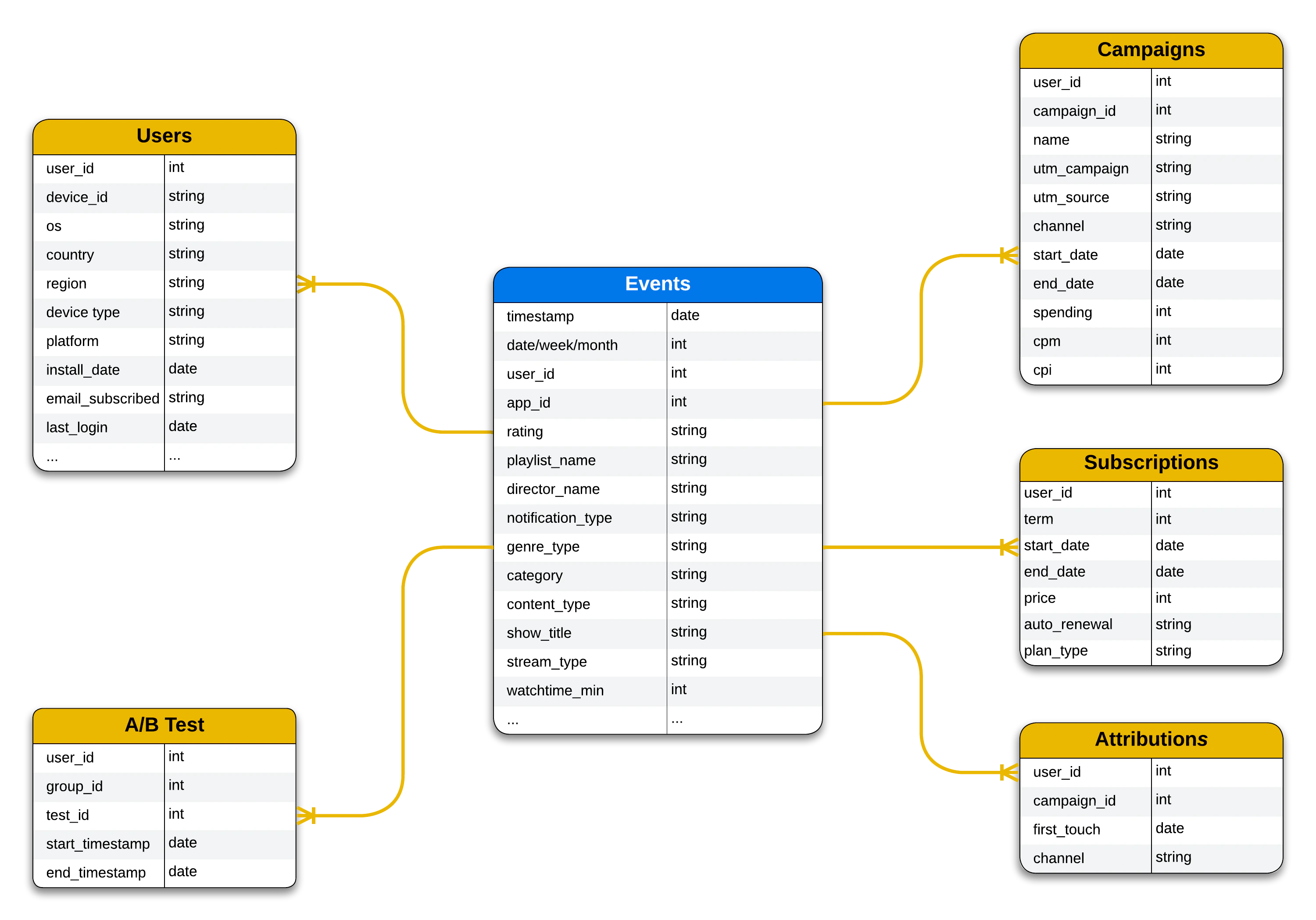 - Dimension tables: Users, Campaigns, AttributionsBelow is a design sample of the proposed data model.