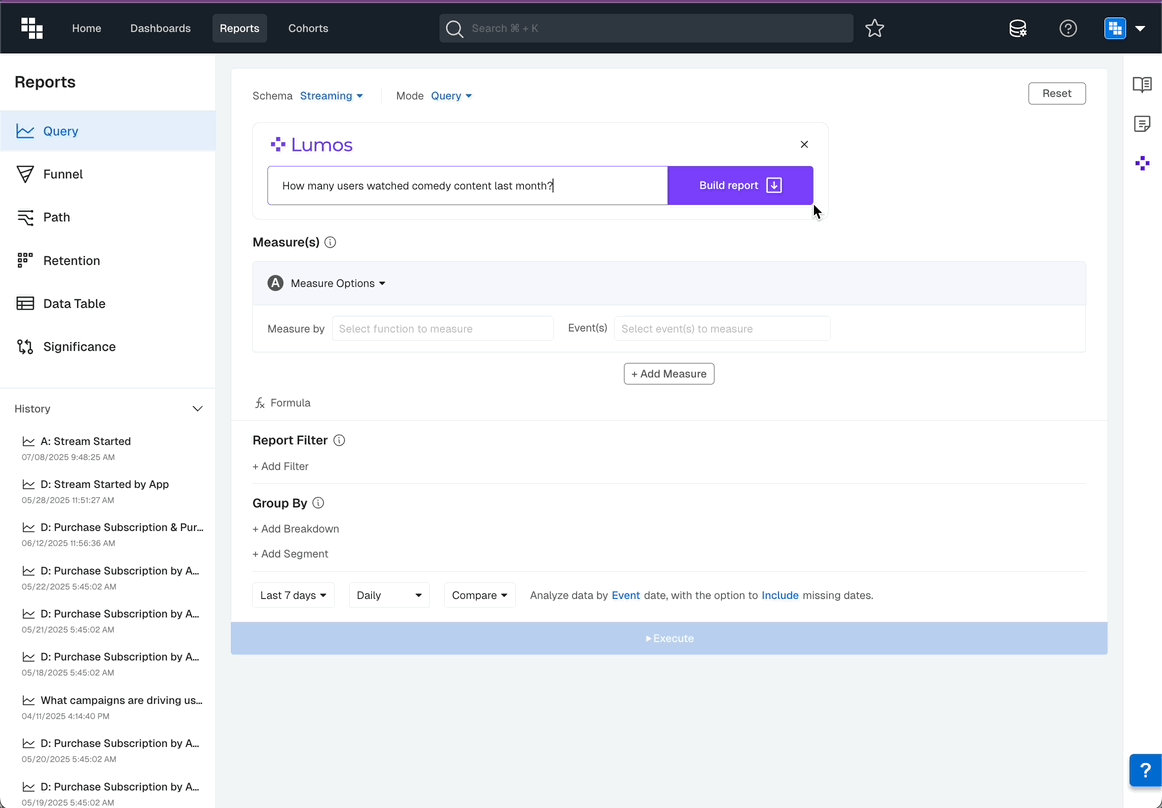 Here are easy steps to follow when creating your reports with natural language.- Select the type of report you want to create from our left hand navigation (i.e. Query, Funnel, Retention) and click into the report type.