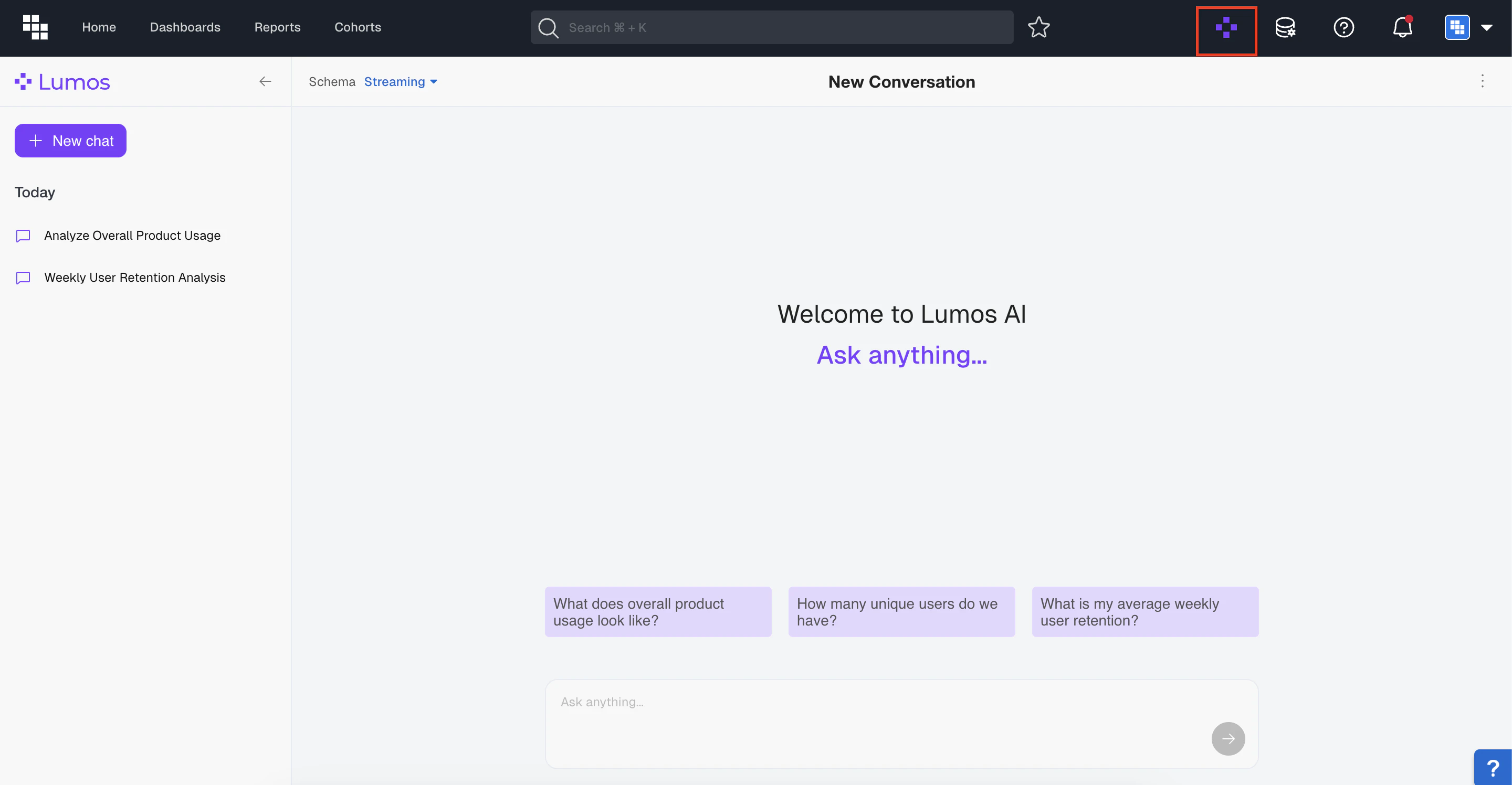 In the Main Navigation bar you can find the Fullscreen Lumos icon to the left of the Data Management Icon. You can type in your question, use case, or report definition in the “Ask anything” box at the bottom,