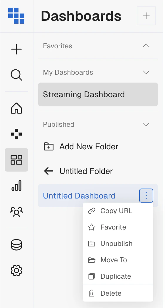 Users can Copy URL, Favorite/Unfavorite, Publish/Unpublish, Move, Duplicate, and Delete Dashboards. These actions are contingent on having the right User Permissions or being the owner of that Dashboard. If you don’t have the right access to select an option, it will be grayed out.