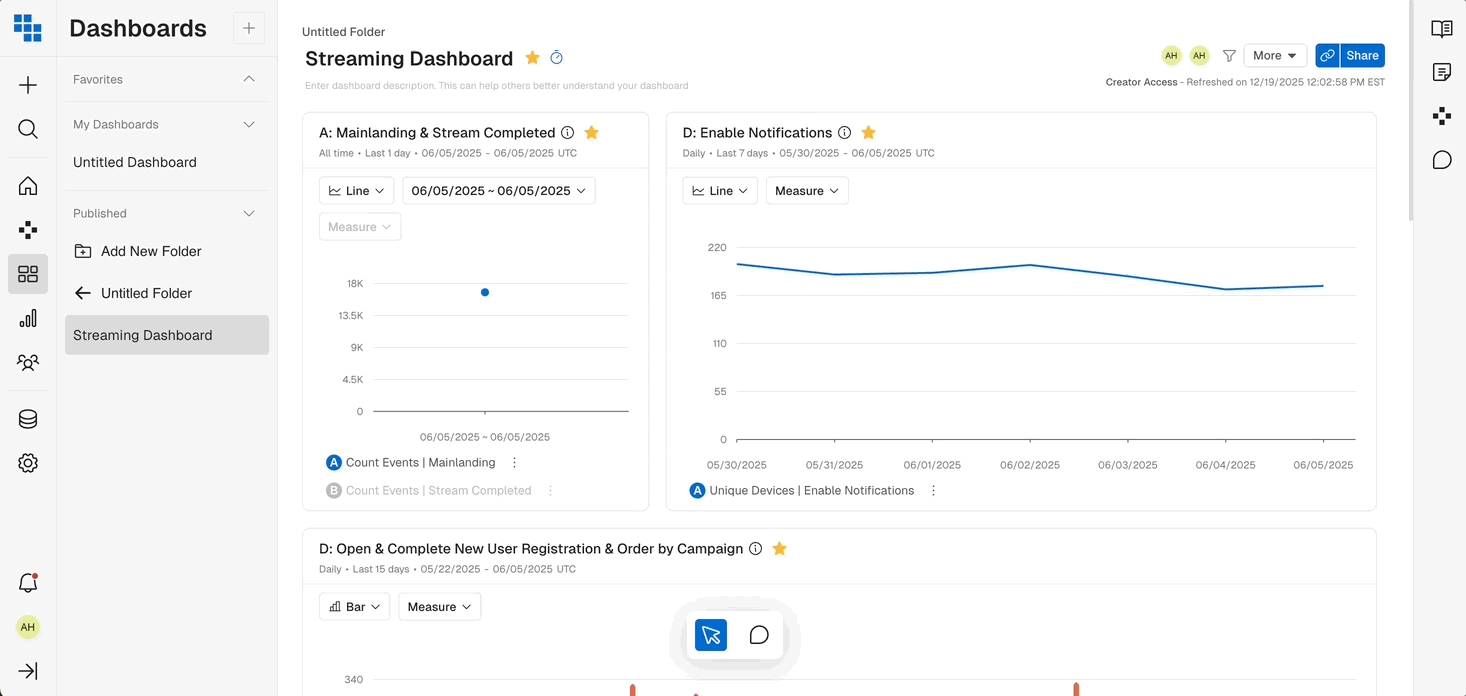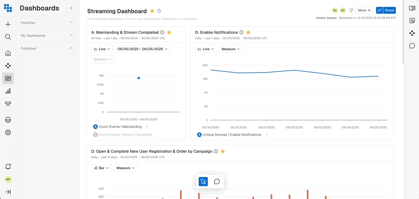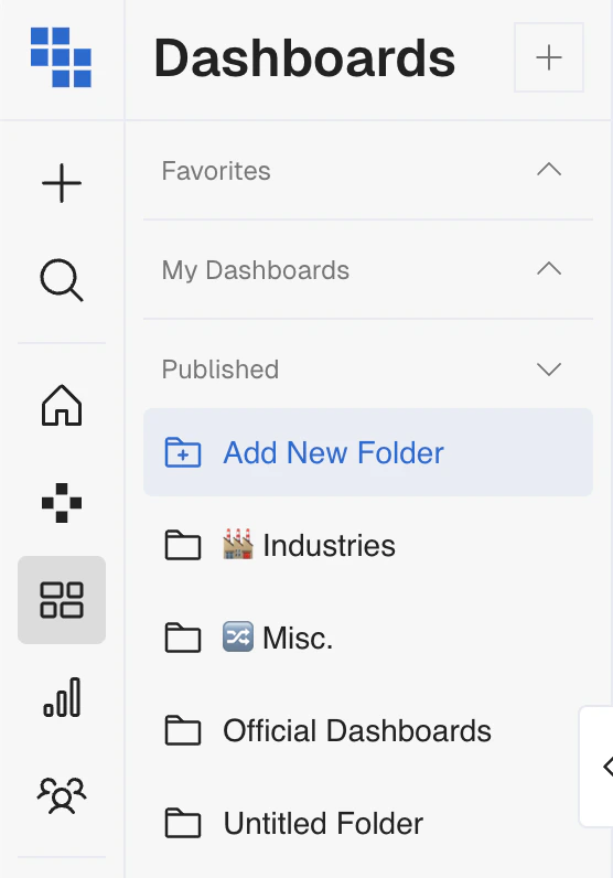 This section is what users will see when they make their own Dashboard for the first time. This will allow them to see all of your unpublished Dashboards. Dashboards here are still visible via Search or shared links with team members.Published Dashboards