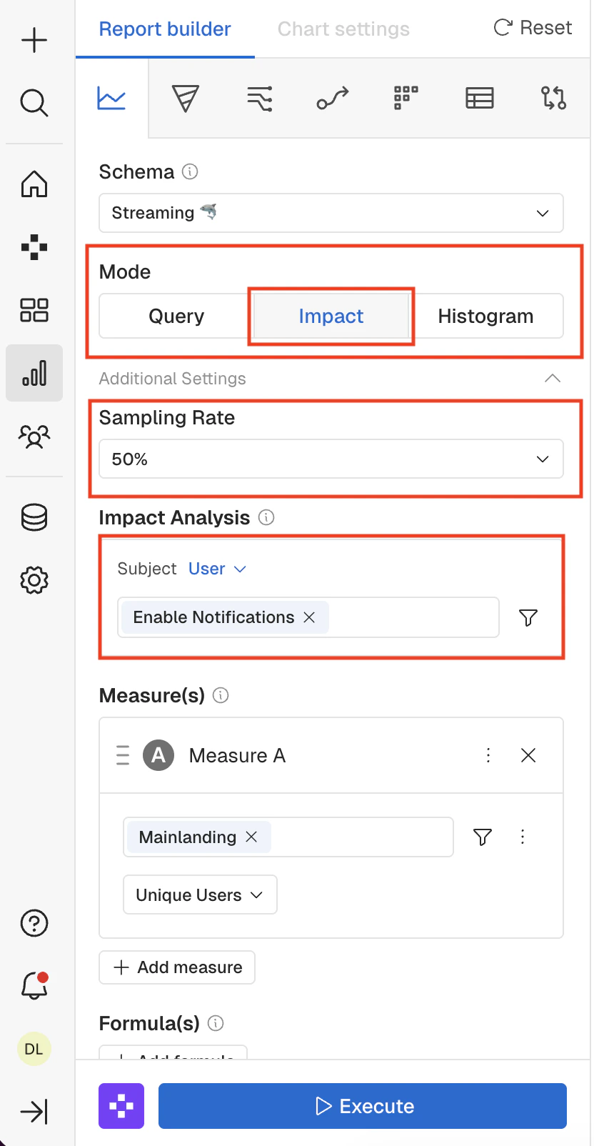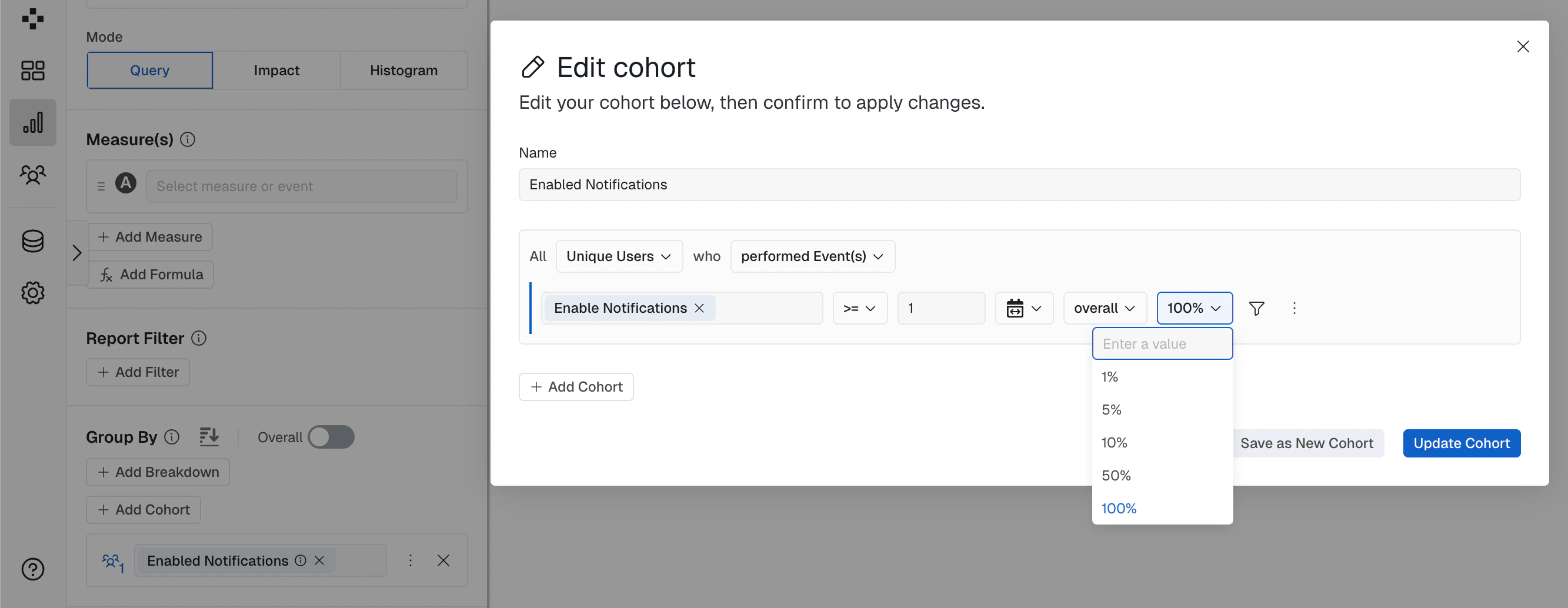 user_id) in order to guarantee that the same users will be analyzed across the steps. For example, in Funnel, Retention, Flow, and Query in Histogram/Impact mode. - Your results only represent the sampled % of the subjects from the complete event data (100%). If your events are evenly distributed, the metric from the sample may be very close to the metric from the full data set.