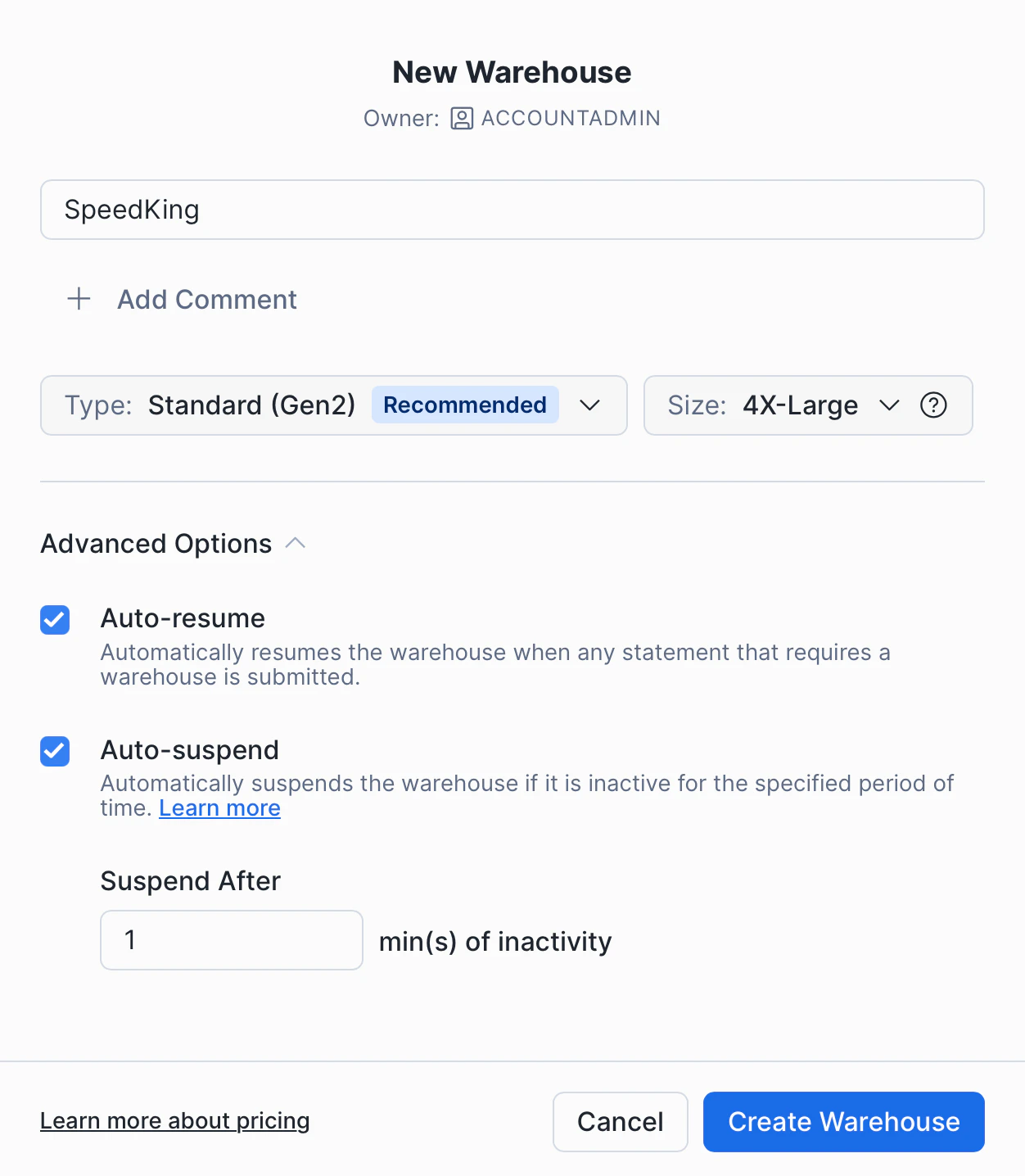 - Auto-resume - you want this on so any activity wakes up the warehouse.