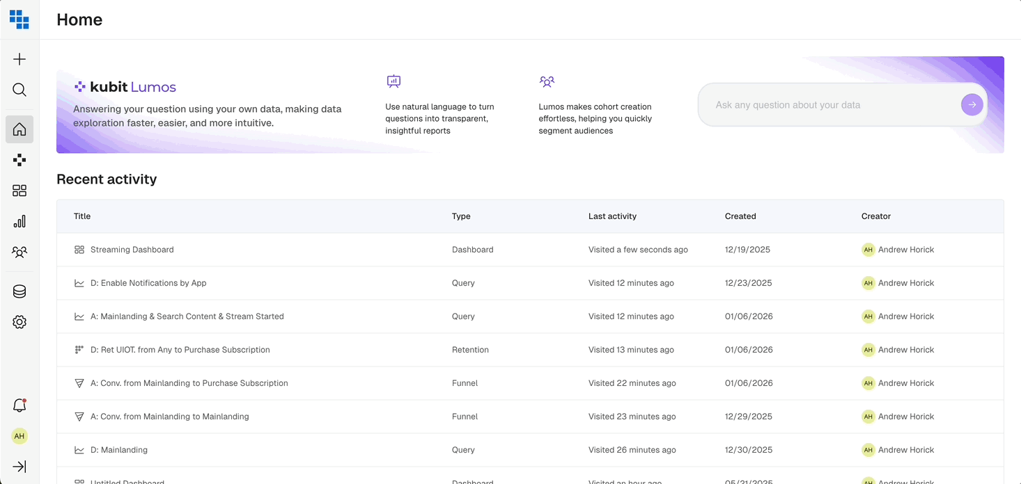 On a Dashboard, you can visualize results from multiple analyses simultaneously. The charts can be refreshed on a schedule to keep track of key metrics. You can create multiple dashboards that contain different charts. All the charts are interactive. If you aren’t creating dashboards, this article will review how to explore them as a viewer. Kubit allows for several interactive features that let you drill deep into insights without modifying the dashboard. More information about creating dashboards is available here.Kubit Dashboards As a Viewer